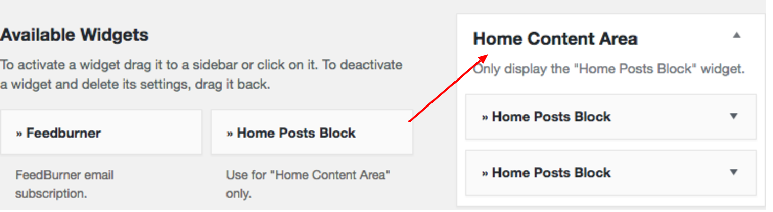 Please put the Home Posts Block widget to the Home Content Area (how to)